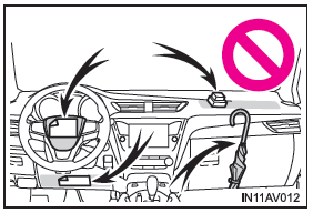 ● Non fissare o appoggiare alcun oggetto su aree quali il cruscotto, l'imbottitura del volante e la parte inferiore del pannello strumenti.