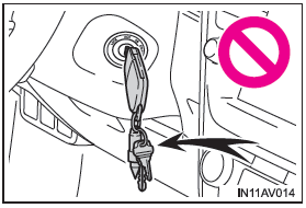 ● Veicoli senza sistema di accesso e avviamento intelligente: non appendere oggetti pesanti, taglienti o rigidi, come chiavi o accessori, alla chiave di accensione. Tali oggetti potrebbero ostacolare l'apertura dell'airbag SRS per le ginocchia oppure potrebbero essere scagliati nell'area del sedile del conducente dalla forza di apertura dell'airbag, costituendo così un pericolo.