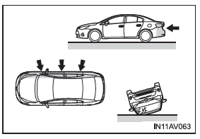 ● Non attaccare alcun oggetto su aree quali le portiere, il parabrezza, i finestrini laterali, i montanti anteriori o posteriori, i longheroni laterali del tetto e le maniglie di assistenza.