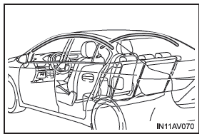 ● Gli airbag SRS laterali e laterali a tendina si aprono in caso di impatto che superi il livello di soglia impostato (il livello di forza corrispondente alla forza d'impatto prodotta da un veicolo di circa 1500 kg che urta l'abitacolo di un altro veicolo proveniente da una direzione perpendicolare alla sua traiettoria a una velocità di circa 20 - 30 km/h).