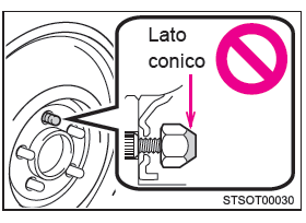 ● Accertarsi che i dadi ruota vengano montati con il lato conico verso l'interno. Il montaggio dei dadi con il lato conico rivolto verso l'esterno può provocare la rottura della ruota nonché il suo distacco durante la guida. Ciò potrebbe provocare un incidente con il rischio di lesioni gravi, anche letali.